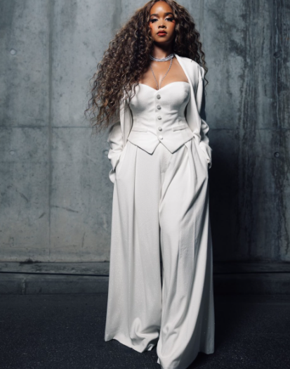 H.E.R shines in a custom Ralph Lauren three-piece. H.E.R.’s look is completed with a tailored blazer and pleated trousers all crafted from crepe silk cady and embellished with 50,000 Swarovski stones adding a starlike sparkle to her outfit.