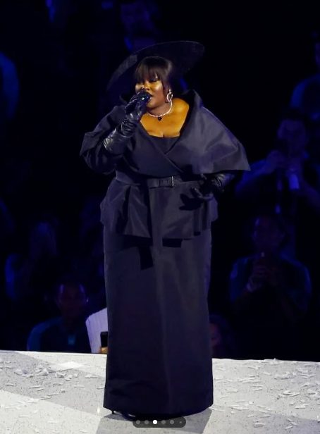 Yseult singer captivated audiences in a breathtaking custom Dior black ‘New Bar’ jacket. The jacket showcases a modern twist on an iconic silhouette. Yseult paired this with a sleek black skirt and tilted Dior hat.