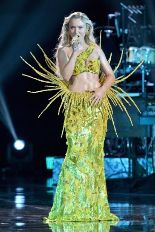 Zara Larsson sparkled in a gold one-shoulder crop top and matching sequin skirt that blended disco glamour with modern tailoring. The look was playful yet powerful a nod to pop star heritage with contemporary sharpness.