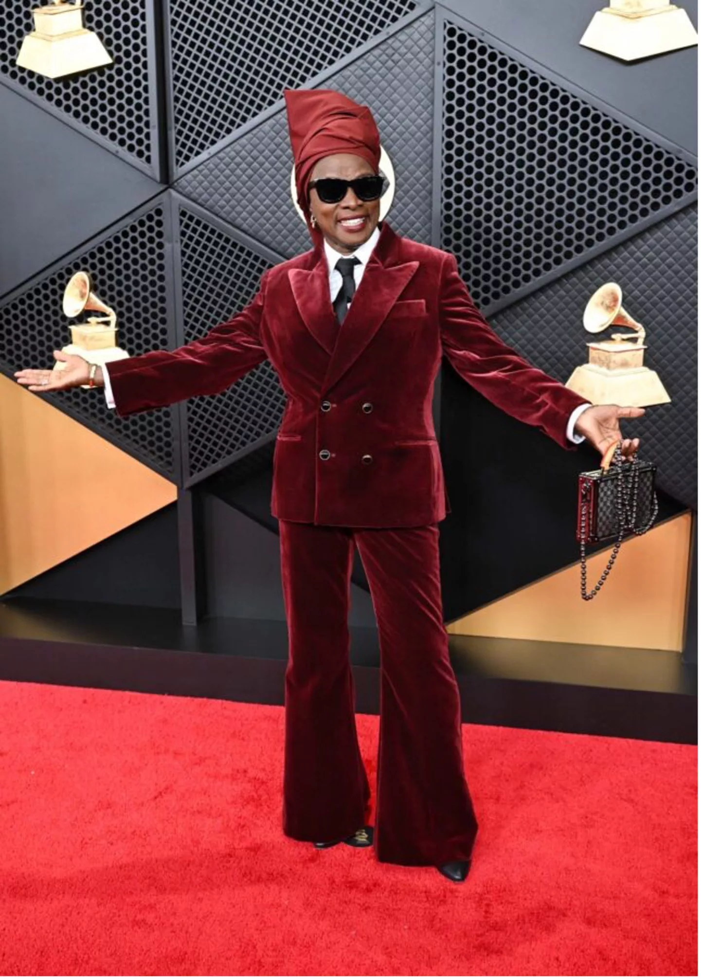 Angelique Kidjo arrived in a burgundy Louis Vuitton suit with coordinating headpiece and sunglasses, delivering a look that felt joyful, regal, and unapologetically powerful. The tailored silhouette honoured heritage while embracing modern extravagance a celebration of identity through colour and form.