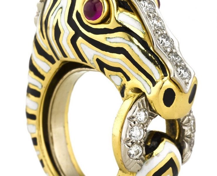 This white and black enamel Zebra ring by David Webb with rubies, diamonds, platinum and…