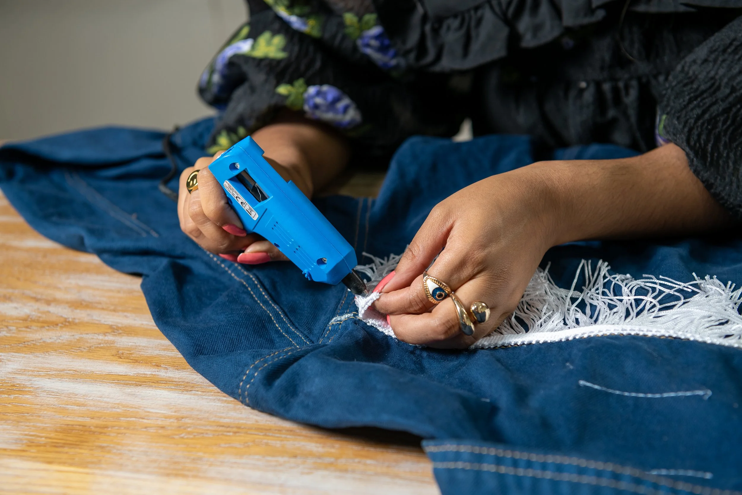 7. Use fabric glue to attach the fringe as close as possible to the yoke seam. Add a second layer of fabric glue for maximum effect. Alternatively, use a glue gun for this process. Press firmly on the binding to secure the glue.