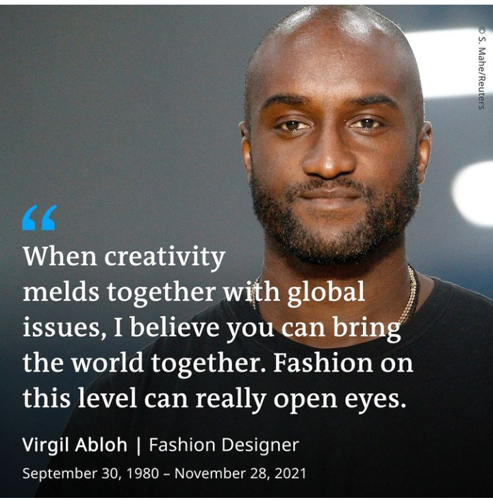 Virgil Abloh the artistic director at menswear Louis Vuitton and founder of Off White has died. He will be remembered for being a visionary and a man who helped others to shine. Our thoughts are with his loved ones.
