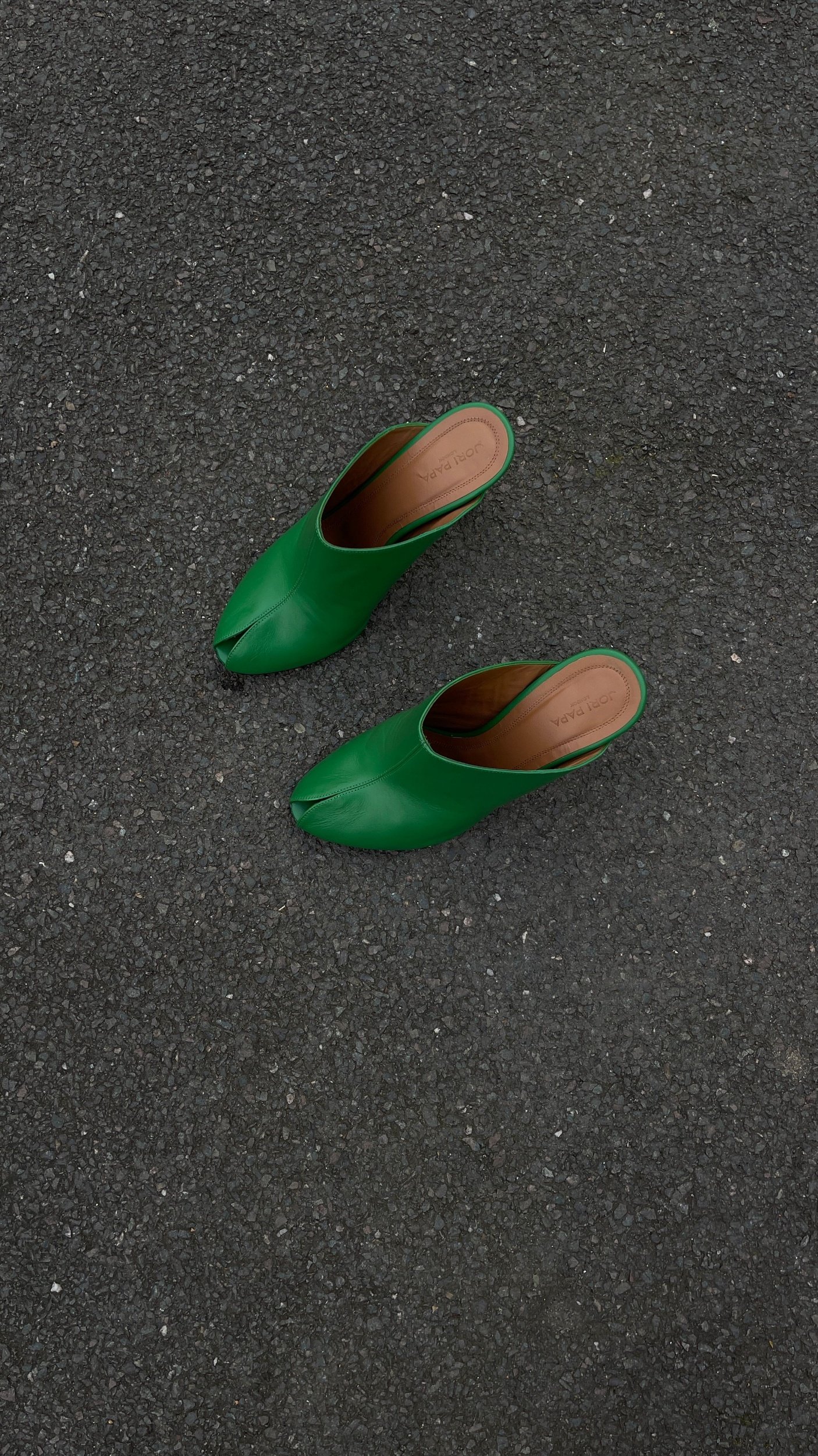A feminine mule with a lot of personality in shamrock green leather with ” V ” shape cut at the toe part all resting on a triangular heel. The green colour is the designer’s favourite as it carries the vibration of growth, new beginnings, health, renewal, harmony, hope, and peace.