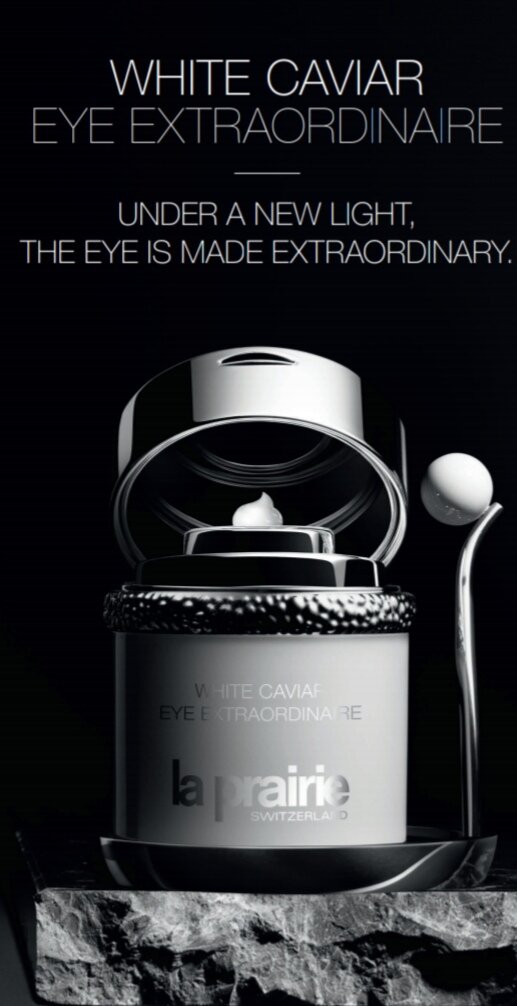 “White Caviar Eye Extraordinaire and it inncorporates an innovative airless pump and a luxury ceramic pearl tool which rotates to increase lymphatic drainage and stimulate microcirculation” – La Prairie.