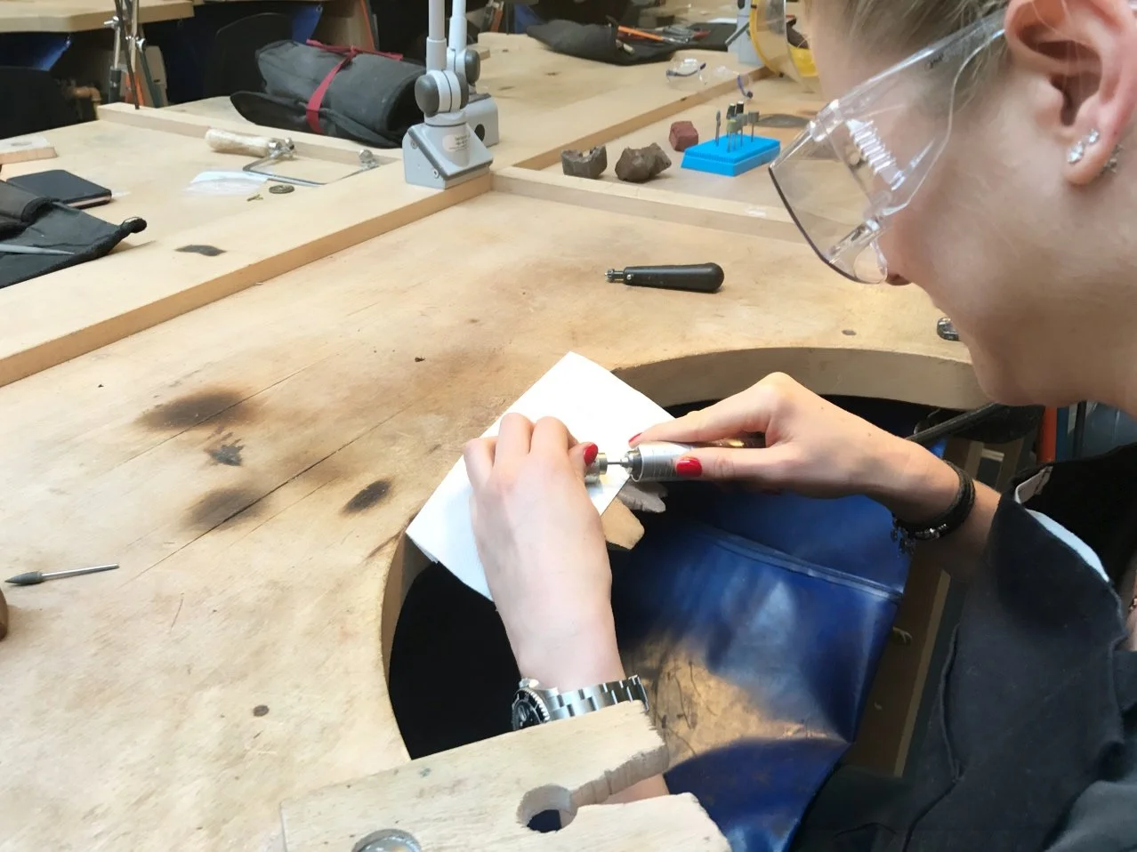 First 3 pictures are from Central Saint Martins, just to show how I started. My bench, me making my first ring ever and the polishing room.”